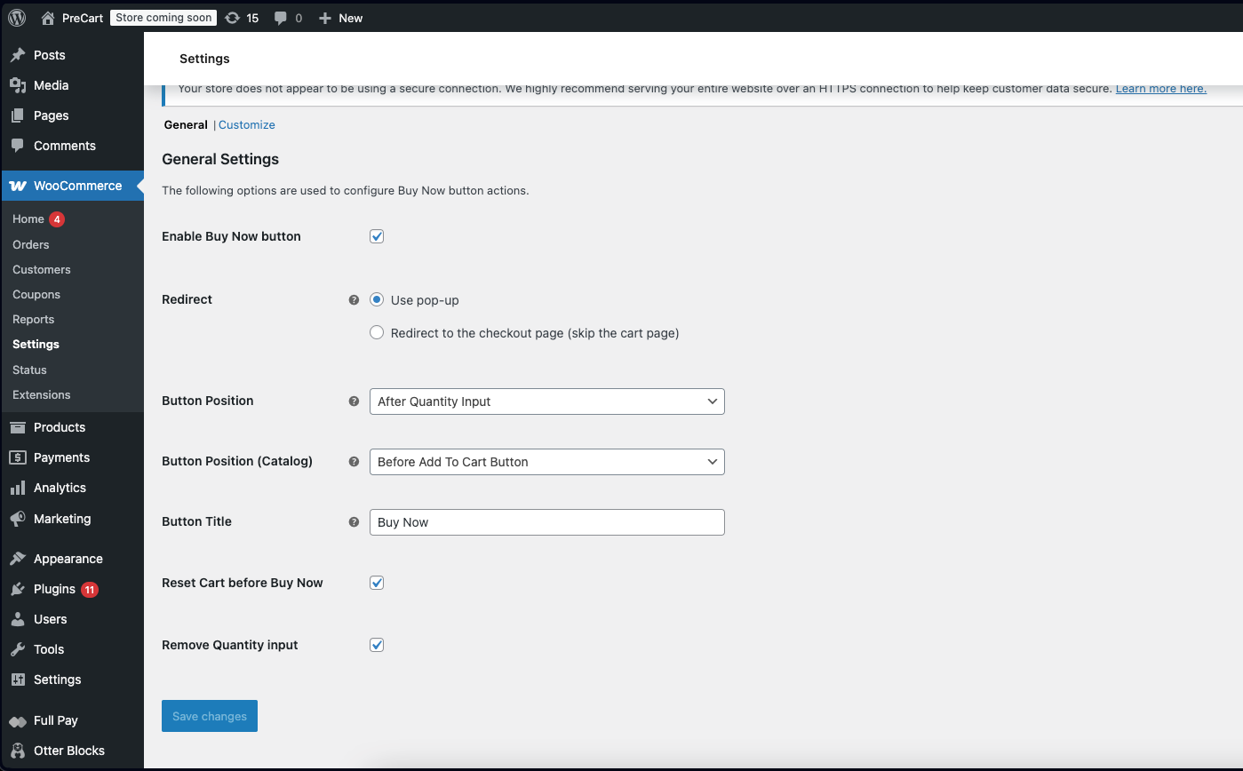 Go to WooCommerce → Settings → Buy Now to access the plugin settings.